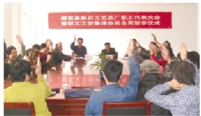 同时,聘请了两名专职集体协商指导员,走访每家企业,摸清县内所有企业集体合同签订情况,建立了翔实的数据库,随时掌握企业集体协商集体合同进展情况。工作思路上从以往的扩大覆盖面向提质增效转变,今年在工业园区的塑胶行业开展了行业性工资集体协商,为全县工资集体协商树立了一个典范,在每个乡镇、园区选树1~2家企业作为集体协商的典型,力求做到点、块、面全面开花。