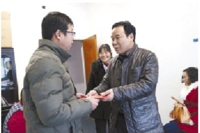 | 磐安县总工会主席张土良(右二)到企业慰问困难职工。 |