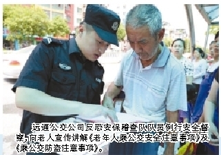 | 远通公交公司反恐安保稽查队队员例行安全督察,向老人宣传讲解《老年人乘公交安全注意事项》及《乘公交防盗注意事项》。 |