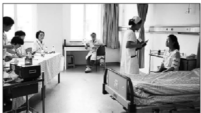 | 养老护理员竞赛现场。右1是扮演患有老年痴呆症老人的志愿者,右2是比武的养老护理员,其他都是现场评委。 |
