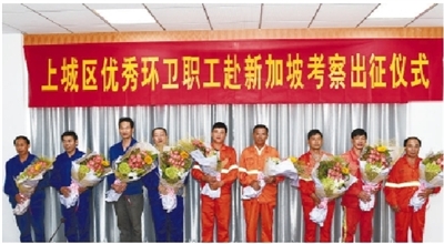 本报讯 记者周金友 通讯员高海伟摄影报道 昨天中午,杭州市上城区城管局为优秀环卫职工赴新加坡考察举行送行仪式,9位出国考察的环卫工人全都是长期在环卫一线从事道路清扫、垃圾清运等工作。