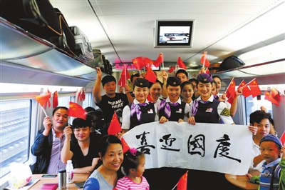 9月29日,值乘G32次的列车长刁倩茹(右一持横幅者),题写了“喜迎国庆”的横幅,与旅客们一起高唱《伟大的祖国》,共庆祖国母亲66周岁华诞。陈慈林 赵敏 摄