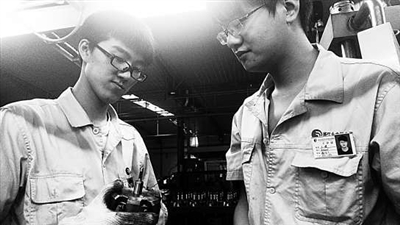 | 刚毕业的浙江信息工程学校的胡祖建(左)在企业里已俨然老师傅,是企业里的小带班导师。 |