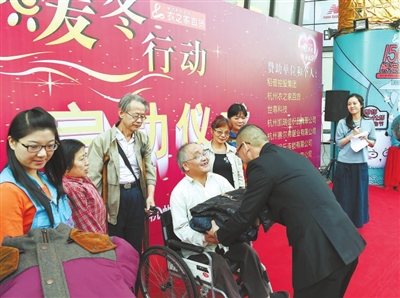 昨天上午,为了让贫困山区的孩子们过上一个温暖有爱的冬天,浙江仁泽公益基金会和杭州市残疾人福利基金会共同发起“2015暖冬行动”。衣之家百货当场捐赠价值5万元的衣物,杭州世尊网络科技和皇后娱乐连锁有限公司各捐赠10万元。杭州5位困难残疾人家庭现场获得捐助的冬衣。