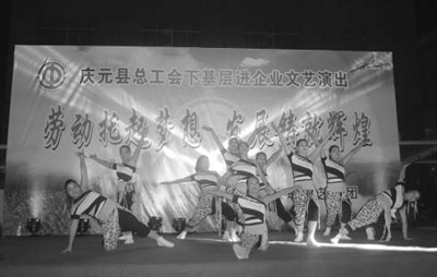 日前,庆元县总工会职工艺术团走进竹口镇瓦窑山工业园,献上了以“劳动托起梦想、发展铸就辉煌”为主题的精彩演出。一个半小时的演出,让观众们饱足了眼福。