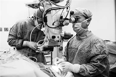 不少老人患了白内障以后,认为年纪大了没有必要治疗或是不能进行手术治疗,给生活带来了许多不便。浙江省中医院眼科主任杜尔罡主任说,其实只要眼部及全身情况允许,岁数再大的老人也可以接受白内障手术。图为杜尔罡主任上周利用微切口为一位101岁的白内障老人进行超声乳化手术,目前,老人的视力恢复良好。见习记者王艳 通讯员于伟 摄影报道