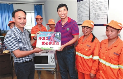 今天,2015年10月26日是浙江省第19个环卫工人节。环卫工作是城市建设工作的重要组成部分,城市人居环境的改善、城市面貌的日新月异,凝结着环卫工人的辛劳和汗水。浙江省建设建材工会自1997年共同参与推动设立浙江省环卫工人节以来,每年的10月26日,都会以形式多样的宣传和活动,体现工会组织对环卫工人的关爱和对环卫工人“宁愿一人脏,换来万家洁”爱岗敬业精神的大力弘扬。今年,为了切实解决广大环卫清扫工存在的喝水、避风、挡雨、如厕等困难,浙江省建设建材工会在全省建设系统工会发出号召,大力组织开展了设立和社会认领“环卫工人爱心休息点”的活动,帮助他们能喝上一杯热水、吃上一碗热饭、解决一个歇脚之地,让广大一线环卫工人实实在在地感受到了工会作为环卫职工之家的温暖。
