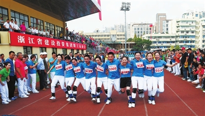 前天,以“弘扬浙建精神,树立铁军形象”为主题的浙江省建设投资集团职工运动会,在杭州举行盛大的开幕式。来自集团总部、浙江建工、香港公司、浙建学院等15支运动队的1300多位运动员,进行了入场式队列表演以及广播体操、趣味运动、田径球类等20多个项目的比赛,以齐心协力争第一的拼搏精神,展示了20万浙建人“不甘人后,奋勇争先”的勇气和风采。