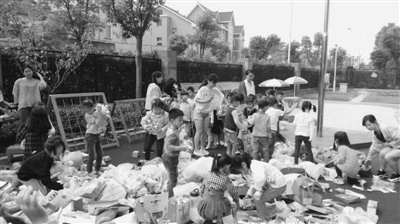 本报讯 记者阮向民 通讯员房晓玲摄影报道10月16日这一天,杭州市滨江钱塘山水幼儿园的宝宝们在上学时,除了肩上的小书包,手上还多了一个袋子,袋子里装着可乐瓶、旧报纸、小纸盒……这些废弃物带到幼儿园干吗?集中变卖,存入“绿色基金”。