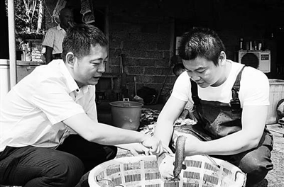 | 兰溪合作银行工作人员向陈浩(右)了解黄鳝养殖情况。 |