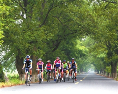 区域内老01省道两侧行道树郁郁葱葱,成为了一条贯穿东西的天然绿色纽带。围绕老公路这一特色,启动了百里钱塘生态绿带工程。盐官古城至丁桥大缺口的12.5公里,沿老公路两旁的地块种植了银杏、桂花、樱花等景观植物,彩色自行车道、休闲步道、茅草亭、景观水体、亲水平台、自行车租赁点、公共厕所等诸多设施已逐渐完善,沿线形成了“丹枫迎秋”、“樱花雪月”、“姹紫嫣红”和“兰薰桂馥”等许多特色景观,加之原有沿途老01省道数十年的枫杨、香樟等行道树的映补,整个百里钱塘就是生态和健康的代名词,更是体验骑行的快乐的生态绿道。