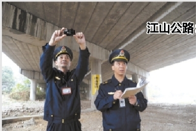 连日来,江山市公路段路政人员对所管辖区内桥梁、涵洞、隧道、护坡等安全情况进行检查,排查防范各类安全隐患。图为路政人员在205国道线对公路桥梁运行情况进行拍摄存档。
