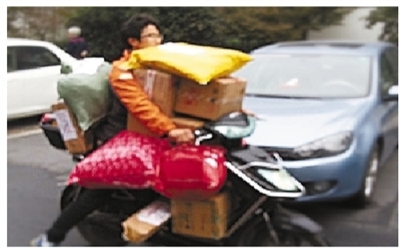 昨天上午,在杭州江城路金钗袋巷口,一位严重超载的“快递哥”摇晃着从一辆小车前擦过,车主紧急停车后,惊恐地喊道,不要命了啊!