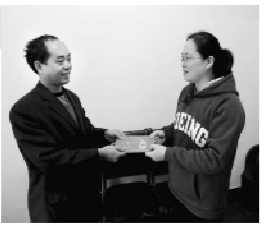 为了鼓励其女儿好好学习,段关工委为兰溪二中读初三的俞璐华送去慰问金,供其购买学习用品和参考书。图为郎晓丹(右)请俞永胜转交慰问金。