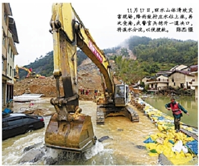 | 11月17日,丽水山体滑坡灾害现场,降雨致村庄水位上涨,再次受淹,武警官兵挖开一道决口,将溪水分流,以便搜救。陈杰 摄 |