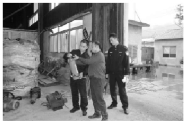 图为龙泉市公安局大沙派出所民警深入企业,面对面对工人进行消防器材安全使用指导。