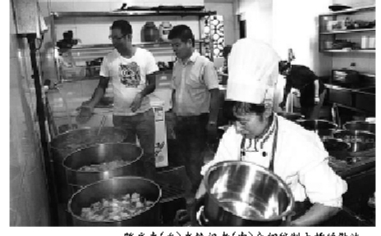 | 陈庆丰(左)在给记者(中)介绍秘制大排的做法。 |
