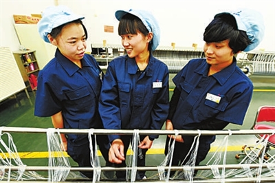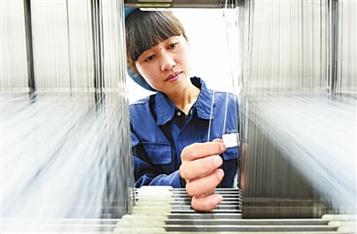 | 安朝香(中)带领徒弟钻研“整经”技术。 |