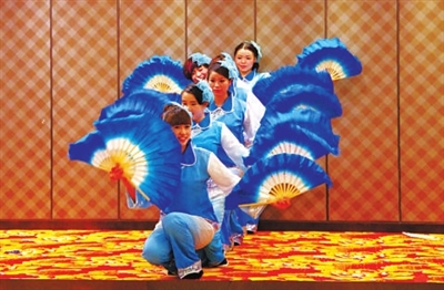 | 在2015年的公司迎新晚会上,多才多艺的安朝香(前一)编导并领舞《青花瓷》。 |