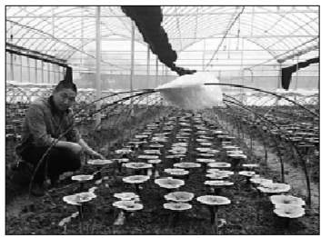 | 毛必庆在公司基地里仔细观察灵芝生长情况。 |