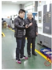 | 李家庆(右)在向记者介绍机器人生产的挂锁配件。 程淑姣 摄 |