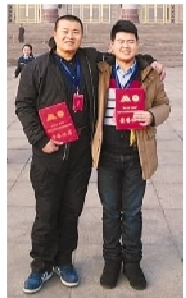 | 图为章双林(左)与王刚在人民大会堂前合影。 |