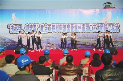 本报讯 通讯员余斌彬 记者吴晓静报道 在温州绕西南工程万全镇工段的宽阔工地上,临时搭建着一个舞台,来自各行各业的职工们在这载歌载舞,为工地上的职工朋友们奉献着自己的精彩绝活。近日,由温州市总工会主办、温州市工人文化宫和温州市交投集团承办的“庆元旦、迎新春”重点工程慰问演出暨温州市职工艺术团成立仪式在这里隆重举行。