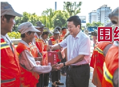 | 温岭市委书记徐淼带领市总工会等有关人员,深入城市建设工地看望高温下仍辛勤工作的一线工人。图为市委书记徐淼向环卫职工赠送防暑物品。 |