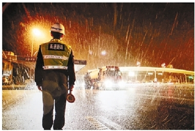 | 1月20日晚8点,浙皖省界已大雪纷飞,湖州高速路政正在指引过往车辆。王成 摄 |