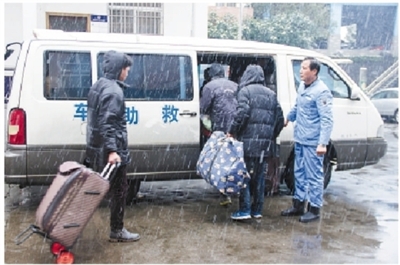 | 昨日下午,杭州市救助管理站工作人员护送14名受助人员返乡。李璞琼 摄 |
