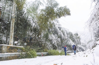 1月21日上午起,鹅毛般的雪片密集地洒落在富阳大地,层层覆盖在银装素裹的村庄上、山林上,不少被积雪压断的毛竹横倒在路边或高压线上,成为特殊天气下电网安全运行最主要的隐患。为此,富阳供电公司19支抢修队伍380余名一线抢修人员开始了全力总动员,备战此次寒潮大雪。图为在富阳区毛竹之乡常绿镇,电力抢修人员正在修剪压线和隐患毛竹。经过近两个小时奋战,当天下午1时该区域受雪灾影响停电村庄全部通电。