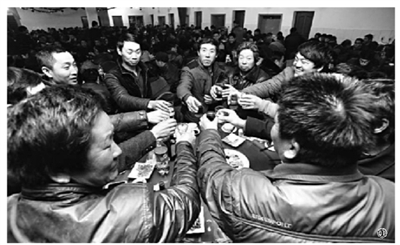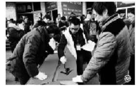 图③ 日前,在东阳市总工会主办的“温暖回家路·报刊送我行——旅途中的阅读”赠书启动仪式上,该市书法家们顶着严寒在车站为返乡农民工书写并赠送春联,祝福大家旅途平安,春节快乐。