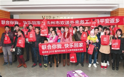 据悉,自2012年起,杭州市总工会携手杭州联合银行,为外来务工人员的春节回家提供了一种更加温暖的选择——由他们主办发起的“联合你我,快乐回家”杭州市外来务工人员平安返乡活动,已经帮助了21000余名经济困难的外来务工人员在春节前夕“免费”回家。