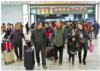 昨天,杭州迎来艳阳天。当日上午,由成都、齐齐哈尔、徐州、烟台、怀化至杭州的列车,陆续抵达铁路杭州站。出站旅客中有许多人是回来上班的,他们带着新年新愿景,提着行李,牵着小孩,大步向出站口走去。据悉,浙江不少中小微企业的春节假期要放到年初十或元宵节后,让辛勤工作一年的员工有足够的时间与家人团聚,欢乐过年。