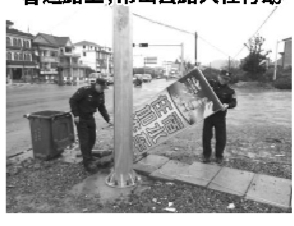 | 图为路政执法人员清理路边广告牌,保畅通保安全。 |