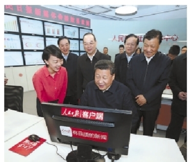 19日上午,习近平首先来到人民日报社调研。编辑楼内,一块块展板、一幅幅照片展示了党中央对人民日报的关怀,反映了人民日报社走过的不平凡历程。习近平一边观看,一边听汇报,他充分肯定人民日报创刊68年来为党和人民事业作出的重要贡献。在总编室夜班平台,习近平看编辑排版,同大家亲切交流,勉励他们不忘初衷、坚定信念,把报纸办得更好,为全国人民提供更多更好的精神食粮。习近平走进新媒体中心,在大屏幕前听取微博、微信、客户端工作介绍,并在一台电脑前坐下,通过新媒体平台发送语音信息,向全国人民致以元宵节的问候和祝福。