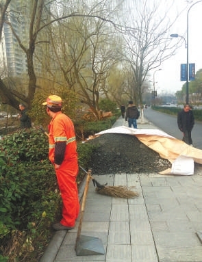 2月26日早上,在杭州余杭塘路69号附近的人行道上,突然多出了一堆渣土,路过的行人只能从非机动车道绕行。负责此路段保洁的环卫工在向负责人汇报后,等待清运垃圾的车辆来搬运。