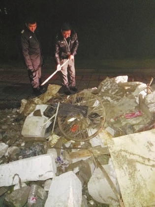 | 图为2月24日晚偷倒在杭州保俶北路海洋二所公交车站附近的渣土,城管队员正在查找线索。 刘宇 摄 |