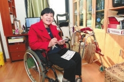 | 坐在轮椅上,53岁的她,青春依旧。 记者周金友 摄 |