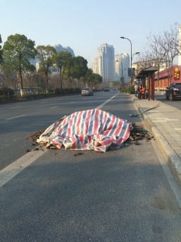 5点50分,记者来到莫干山路803号附近时,发现对面的非机动车道上用彩色塑料布盖着一堆东西,停好车过去看个究竟。