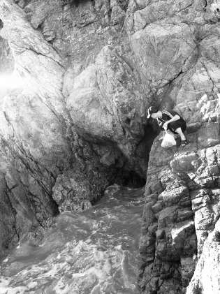 有一日,我们沿着劈立的礁石翻越前往,见拍浪飞溅,很是惊险,到了电力高塔下方,看到一处斧劈式的缺口,口子陷于山体下的大礁石里,浪涌进去又灌出来,近听,碓石内有闷闷的回音,像是到了龙洞口,只可惜无法进去。