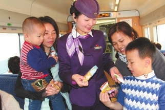 | 春运期间,郑巧红为小旅客服务。冯州 摄 |