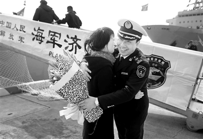 | 凯旋时与妻子拥抱。 华志波 摄 |