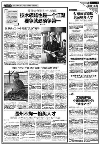 2014年,张积贵应邀在龙湾区职业技术学校开设了劳模育才班,张积贵即传授技艺,更传授一种精神——工匠精神,或是他眼里的武侠精神。