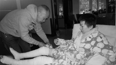 | 现如今,理发店被迫关门歇业,美发师吴渭忠变成了护理师,每天为妻子傅丽红换药疗伤,还得为维权上访奔波。 |