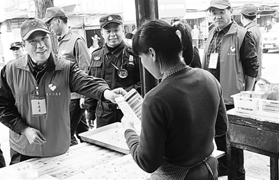 3月19日,衢州20多位全国、省、市三级劳模穿上红马甲,戴上小红帽,当起城市管理志愿者,参与“城市管理日行万步行动”,现场体验衢化片区的市容环境综合整治工作。劳模志愿者们还就如何提升综合执法和城市管理水平、推进文明城市创建各抒己见、献计献策。图为衢州市劳模廖田华(左一)向群众分发《衢州文明城市市民读本》。