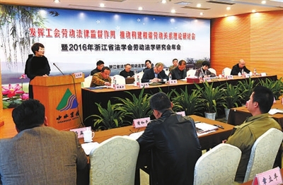 本报讯 记者周金友摄影报道 昨天,在杭州召开的“发挥工会劳动法律监督作用,推动构建和谐劳动关系理论研讨会”暨2016年省法学会劳动法学研究会年会上,来自人大、工会、司法、高校、新闻、企业界的50多位专家、学者和工会干部等,围绕“工会劳动法律监督的必要性和可行性”、“发挥工会劳动法律监督作用”主题,展开了热烈研讨,提出许多富有建设性的意见和建议。