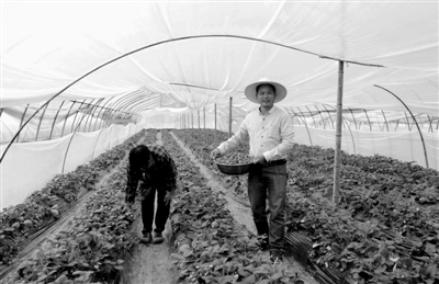 开化县兴旺家庭农场在杨林镇云山桥村流转土地50亩,使用鸡粪、菜籽饼等有机肥生态种植草莓、西瓜、蔬菜等,畅销江西德兴、婺源等周边市县以及本地,同时提供采摘游,年收入达20多万元。图为业主留兴旺(右)正在大棚内采摘草莓。