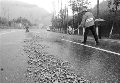 近日,江山市公路路政大队日常巡查时,在205国道江山段上王路段时发现有大量碎石洒落在路面上,造成由东向西的半幅路面无法通行。路政员立即通知公路站并协助道工将碎石清理出路面,避免了因抛洒滴漏引发交通事故的发生。图为清理现场。