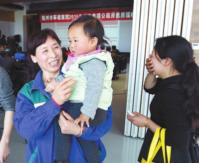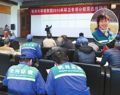 记者周金友 通讯员金励摄影报道 昨天下午,在杭州天子岭垃圾填埋场“杭州市环境集团2015年环卫专项公租房选房现场”,首批100位环卫工人“上台”选房,欢喜、兴奋的表情,写在每一个人的脸上。